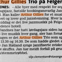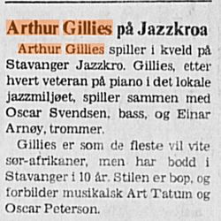 Gillies ankom ankom Stavanger 1967, hvor han fikk jobb som pianostemmer ved Dahls musikkforetning. Arthur ble en viktig del av byens hjazzmiljø, og samarbeidet mye med lokale musikere innen sjangeren. Han ble kjent som en fargerik og energisk utøver, som fremførte musikken med følge av god humor.