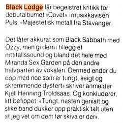 Black Lodge hadde sitt utspring fra 60 Sone Satan. Musikken deres skildret det moderne kaos.De tok i bruk to vidt forskjellige vokalstiler, growl og ren kvinnestemme. De flørtet hverken med black metal eller satanisme, sjangeren var progressiv doom/death metal. Selv om dette ga et dystert uttrykk, var bandmedlemmene i bunn og grunn det helt motsatte.