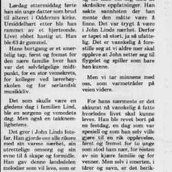 John Lind var en høyt verdsatt pianist, pedagog, arrangør og komponist i Kristiansand. Men han hadde også stor betydning for musikklivet i sin fødeby, Egersund.Han komponerte også musikk til August Mauritzens Stavangerviser.