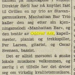 Trioen var oppkalt etter sin kjenningsmelodi «Manhattan Bar». Dette var musikere av høyt nivå: Oddvar Ask (kapellmester, piano, trekkspill), Per Larsen (gitar) og Oscar Svensen (bass). De bydde på et fyldig og festlig repertoar med sang og musikk.