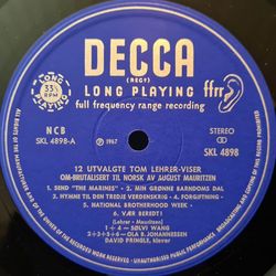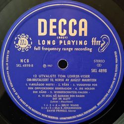 Tom Lehrer er en amerikansk visesanger, komiker og matematiker. Han er mest berømt for sine mørkt komiske, gjerne makabre, satiriske pianoviser som han begynte å skrive mens han studerte ved Harvard og fremførte frem til rundt 1960-tallet.I 1967 fikk tv, humor, satiriker og visepioneer August Mauritzen fra Stavanger Tom Lehrer til å besøke og opptre i Norge. Samtidig fikk Mauritzen tillatelse til å oversette noen av den amerikanske satirikerens tekster til norsk. Etter Mauritzen hadde omskrevet visene til norsk, ble de igjen oversatt til engelsk, slik at Lehrer kunne godkjenne dem.Ukebladet «Nå» mente at August Mauritzen hadde klart det «umulige» i å oversette Tom Lehrers «Den er så god å holde , din hvite lille hånd. Men fingrene er kolde. Det skal ei være sånn ! Det beste ville vært om du selv var her, my dear. Nå har jeg kun din hånd som en deilig souvenir» . Morbiteten klede også det norske språk.August Mauritzen hadde beskrevet Tom Lehrer slik i Dagbladet «Han er noe av det følelseskaldeste jeg noensinne har iakttatt. I løpet av to timers samtale…trekker han ikke på smilebåndet en eneste gang…Sangene ble fremført av Sølvi Wang og Ola B. Johannesen. «Nå» mente på denne siden , at ting ikke ble helt det samme uten den ekte Tom Lehrers personlighet.