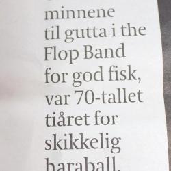 THE FLOP BAND - del 2 , 1976 - 1982.Leif Arne og "Folen" ville at bandet nå skulle få ett annet uttrykk og sound. Jan "Jallis" Hilmar Solbakk kom med på bass og John Bernar Espeland overtok tangentene. I tillegg fikk bandet ny sound ved at Håkon Eidesen tok med seg saksofonen og ble medlem i bandet. Juni måned startet øvelsene i Låven ved Haraldshallen, og 24 nye låter var klare til første spillejobb i Sandeid Samfunnshus september samme år. Flere jobber ventet og nå var det bare kjekt. Det var reising til Bergen og Stavanger, samt flere jobber på "Snorre". Det var bare en ting som kunne ødelegge; militæret! John B. var innkallt til 5 januar og skulle sendes til Bardufoss, Håkon og Jallis reiste 10 januar til forlegninger på østlandet. Og vi som hadde booket spillejobb i Straumen påfølgende lørdag! John B ble heldigvis sendt hjem samme dag???, og kom glad inn på Snorre resturant (vårt stamsted) og meddelte budskapet til resten av gjengen. Jallis kom seg også greit hjem etter hele 3 dager i militæret, men Håkon var det mer spennende med. Han dukket først opp på Snorre fredag kveld, dagen før spillejobben, og dermed var det bare å kjøre på. (story fortsetter...)
