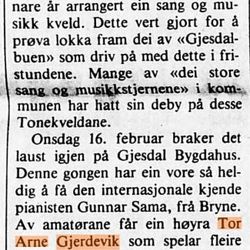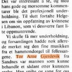 «Totto» har blitt kjent for å legge entusiasme og sjel i dirigentrollen. Både kropp og ansikt viser at dette er noe han ånder for. Han har ingen musikkfaglig utdanning. Arrangering ble en hobby. Gjerdevik har ellers spilt i flere grupper som Roulets, Longwhiles, samt opptrådt solo.