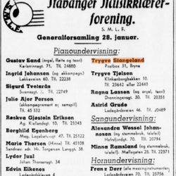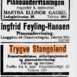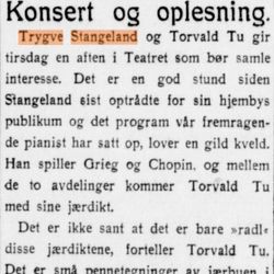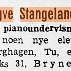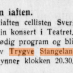 Trygve Stangeland siktet tidlig mot en karriere som konsertpianist. Det ble studier under kjente pedagoger i både inn og utland, spesielt i Tyskland og Frankrike. Etter å ha holdt konserter i hjembyen og hovedstaden, ble han hyllet som en lovende ung kunstner. Trygve hadde en sjeldent stor begavelse, men dessverre satte sykdom en stopper for konsertkarrieren.