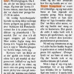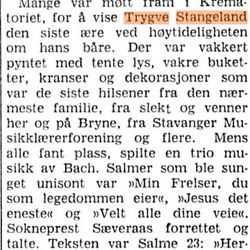 Trygve Stangeland var en enestående pedagog,som spente seg over et stort register. Med sin psykologiske innsikt fikk han frem det beste i hver elev. Han var levende interessert i alle, og studentene ble som en del av ham selv. Stangeland var en elsket mann, og pianotimene hans ble en rik opplevelse.
