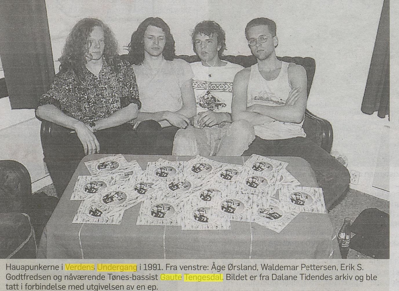 I 1991 kom Verdens Undergang med sin første utgivelse, EP-en «I Vesterled». den var stort sett selvfinansiert, og ble spilt inn i SS-studio på Ålgård. Tekstene harselerte med det etablerte og småborgerlige på en sterkt ironisk måte. Dette ble variert mottatt blant publikum. På Nærbø gikk folk amok. I Stavanger lyttet de kritisk. I Flekkefjord forlot de lokalet. Verdens Undergang ville fremstå som «ANTI». De ble omtalt i flere rockemagasiner.